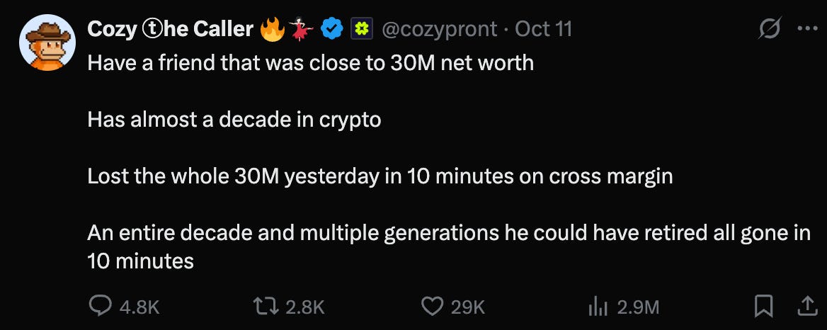 is the crypto dream collapsing? the elephant in the room that we must start with is the most recent crypto plunge, which follows singapore’s biggest token2049 festival which was very well attended. this crash was historically large, with nearly $20 billion in leveraged positions liquidated in a single 24-hour period - over ten times the liquidations during both the 2020 covid crash ($1.2 billion) and the 2022 ftx collapse ($1.6 billion). this liquidation event set a new record in crypto history for sheer volume and number of affected traders (over 1.6 million). bitcoin prices dropped sharply but later partially recovered.